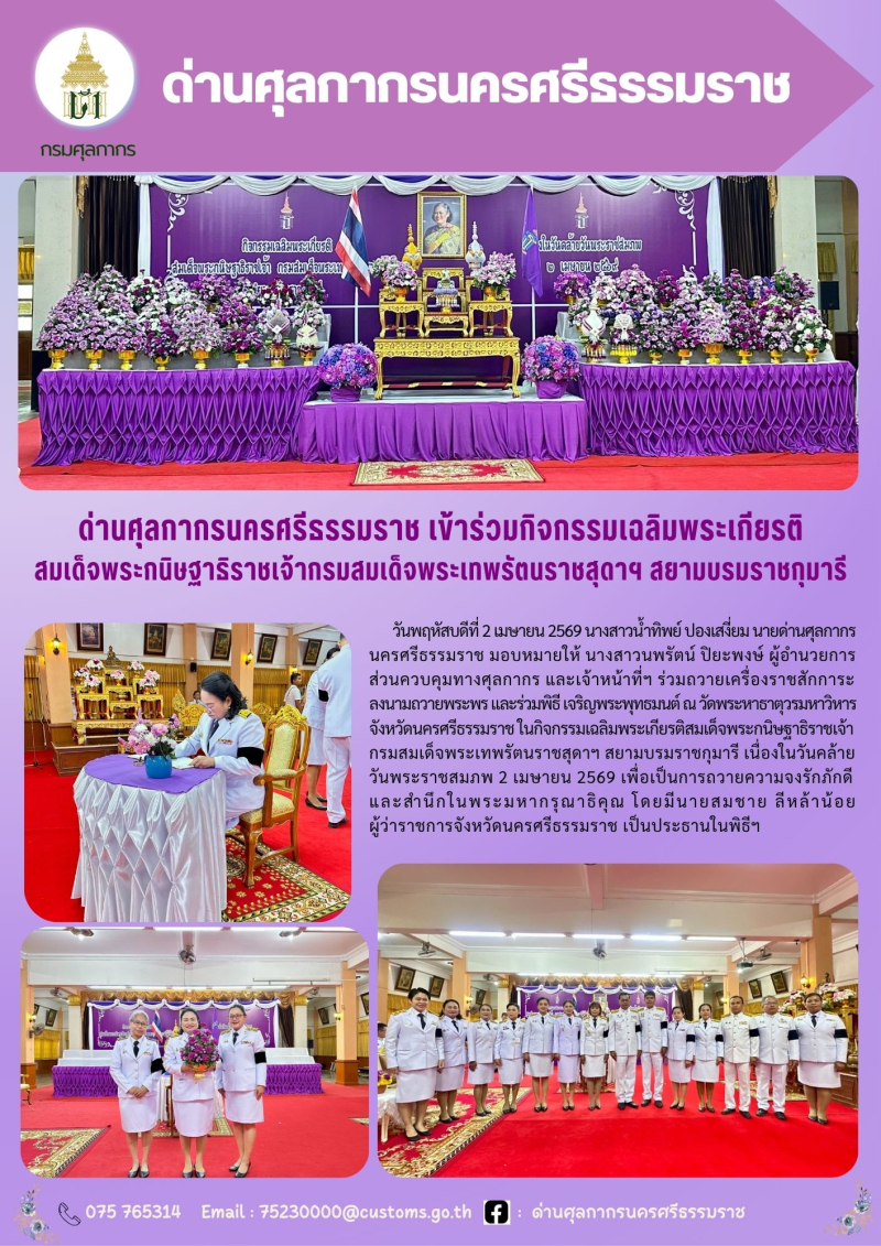 ด่านศุลกากรนครศรีธรรมราช เข้าร่วมกิจกรรมเฉลิมพระเกียรติ สมเด็จพระกนิษฐาธิราชเจ้ากรมสมเด็จพระเทพรัตนราชสุดาฯ สยามบรมราชกุมารี